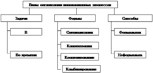 В зависимости от задачи различают организацию инновационных процессов в пространстве (где? кто?) и организацию инноваций во времени (когда?). Организация инновационных процессов в пространстве означает формирование организационной структуры инновационных процессов, соответствующей характеру и масштабам реализуемых проектов. Под организационной структурой понимаются состав и формы взаимосвязи элементов этих процессов. Элементами структуры выступают отдельные руководители и работники, службы и подразделения. Организационная структура формируется из двух взаимосвязанных составных частей: структуры управления инновациями и научно-производственной структуры.