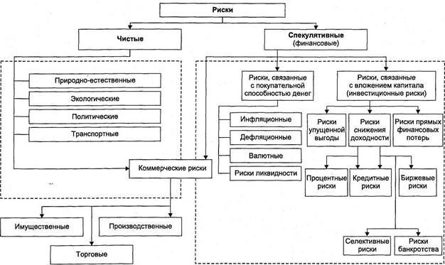 Спекулятивные (финансовые) риски — это, прежде всего, риски, которые характеризуют потери (снижение прибыли, доходов, потери капитала и т.п.) в ситуации неопределенности условий финансовой деятельности организации. Финансовые риски подразделяются на три вида. Это риски, связанные:
