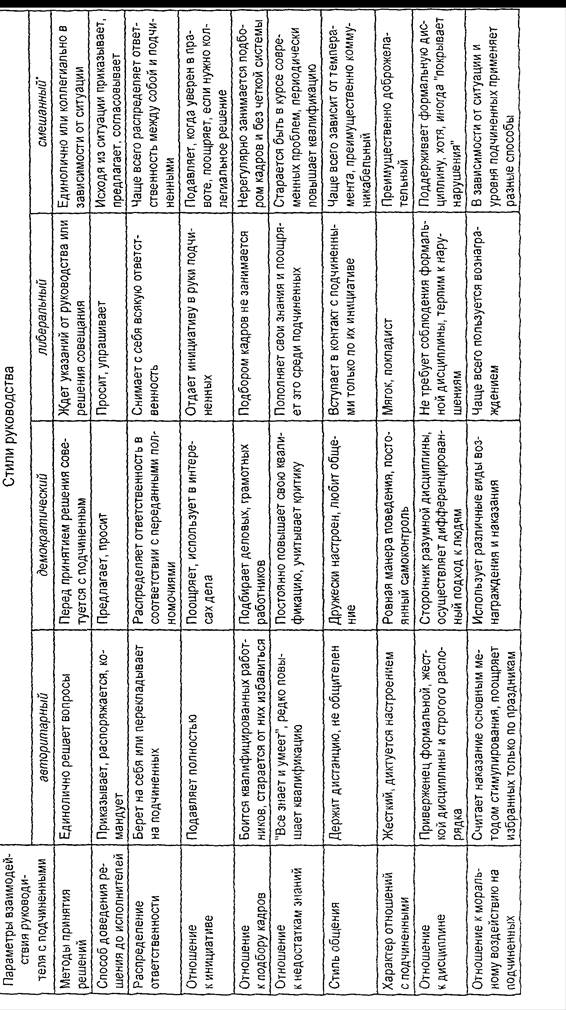 Смешанный стиль предусматривает сочетание перечисленных выше типов. Либеральный, авторитарный и демократический стиль могут преобладать у того или иного руководителя, но иногда не достигают абсолюта, так же как в природе нет чистых холериков, флегматиков, сангвиников, и меланхоликов. [ 1] Далее в таблице №1 приведена характеристика стилей руководства