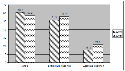 Данные, представленные в 14, свидетельствуют о значительном превышении цены продукции основных конкурентов над продукцией ООО «Покров». Так, например, «булочка с отрубями» (строка 9) производства ЧП Рыженкова С.А. стоит на 50% больше, чем такая же продукции предприятия ООО «Покров». Такое значительно превышение (30–50%) присутствует по всему товарному ассортименту.