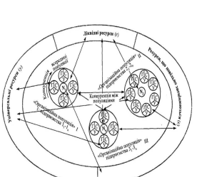 Класс неиерархических моделей базируется на идее о наличии нескольких связанных между собой и не подчиненных друг другу элементов, размещенных вне предприятия (организации). Главное здесь - утверждение о наличии элементов, которые так или иначе влияют на определение целей, распределение ресурсов и формирование места предприятия (его имиджа) на рынке. Акцентируется внимание на сформированной под воздействием внешних элементов структуре целей, распределение властных полномочий и налаживании эффективного взаимодействия между компонентами внешней среды. Наличие такой модели обусловлено еще и тем, что, как утверждает Дж. Гелбрейт, границы внешней и внутренней среды несколько размытые в результате взаимопроникновения элементов организации и среды (например, собственная система распределения продуктов или наличие филиалов, дочерних предприятий, связанных договорными отношениями с главным, и так далее).