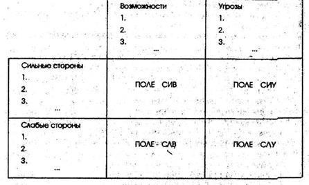 Слева выделяется два блока (сильные стороны, слабые стороны), в которые соответственно выписываются все выявленные на первом этапе анализа стороны организации. В верхней части матрицы также выделяется два блока (возможности и угрозы), в» которые выписываются все выявленные возможности и угрозы. На пересечении блоков образуется четыре поля: СИВ (сила и возможности); СИУ (сила и угрозы); СЛВ (слабость и возможности); СЛУ (слабость и угрозы). На каждом из полей исследователь должен рассмотреть все возможные парные комбинации и выделить те, которые должны быть учтены при разработке стратегии поведения организации.