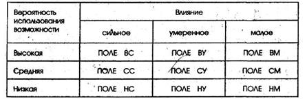 Матрица строится следующим образом: сверху по горизонтали откладывается степень влияния возможности на деятельность организации (сильное, умеренное, малое); слева по вертикали откладывается вероятность того, что организация сможет воспользоваться возможностью (высокая, средняя, низкая). Полученные внутри матрицы девять полей возможностей имеют разное значение для организации. Возможности, попадающие на поля ВС, ВУ и СС, имеют большое значение для организации, и их надо обязательно использовать. Возможности же, попадающие на поля СМ, НУ и НМ, практически не заслуживают внимания организации. Использовать возможности, попавшие на оставшиеся поля, можно, если у организации имеется достаточно ресурсов.