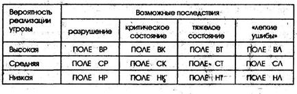 Похожая матрица составляется для оценки угроз (рис, 4). Сверху до горизонтали откладываются возможные последствия для организаций, к которым может привести реализация угрозы (разрушение, критическое состояние, тяжелое состояние, «легкие ушибы»). Слева по вертикали откладывается вероятность того, что угроза будет реализована (высокая, средняя, низкая).
