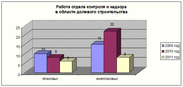 В сфере долевого строительства проведено 14 проверок (6 плановых и 8 внеплановых) (в I полугодии 2010 года – 30), осуществлялся контроль деятельности 88 организаций-застройщиков (в I полугодии 2010 года – 70), привлекающих денежные средства участников долевого строительства многоквартирных домов на территории Иркутской области. Данными организациями возводятся 162 объекта (в I полугодии 2010 года – 105) капитального строительства с привлечением средств дольщиков.