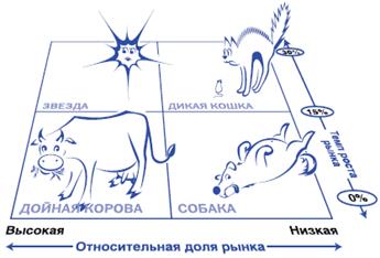 Квадранты матрицы БКГ называются: дойные коровы, звезды, вопросительные знаки (также для этого квадранта встречаются названия трудные дети и дикие кошки) и собаки.
