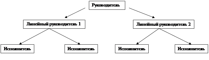 Сущность линейной (иерархической) структуры управления состоит в том, что управляющие воздействия на объект могут передаваться только одним доминантным лицом – руководителем, который получает официальную информацию только от своих, непосредственно ему подчиненных лиц, принимает решения по всем вопросам, относящимся к руководимой им части объекта, и несет ответственность за его работу перед вышестоящим руководителем.