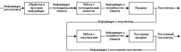 Сам процесс продажи подразумевает достаточно большой поток информации, получаемой от потенциального клиента. При этом главная задача клиентской базы сделать эту информацию доступной для компании в случае ухода менеджера, перехода его на другой участок работы и т.п. Следует отметить и важность дополнительной информации, которую может получать менеджер из клиентской базы в процессе продажи. Как уже упоминалось, это может быть рыночная информация, кроме того, важно иметь информационную поддержку. Шаблоны писем, прейскуранты и т.д., с одной стороны не имеют отношения непосредственно к клиентской базе, с другой включенные в информационную систему компании экономят время и повышают эффективность работы.