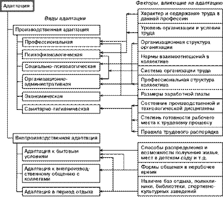 Адаптация - взаимное приспособление работника и организации, основывающееся на постепенном включении работника в процесс производства в новых для него профессиональных, психофизиологических, социально-психологических, организационно-административных, экономических, санитарно-гигиенических и бытовых условиях труда и отдыха[1]