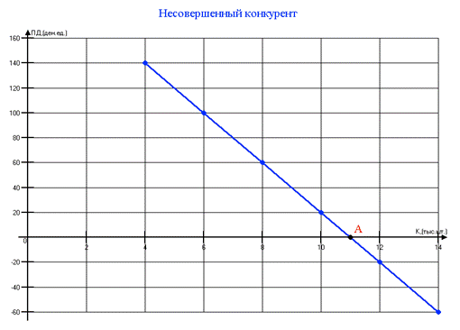 График для несовершенного конкурента показывает, что при увеличении количества продукции постепенно снижается предельный доход; (•)А – критическая точка выпуска объёма продукции после которой ПД уменьшается; 11тыс.шт. – предел выпуска продукции (абсолютное снижение выручки).