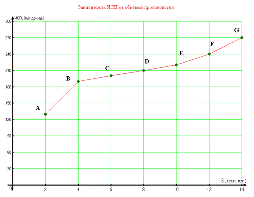 1. Участок графика (A-B) указывает на то, что при начальном объёме производства (2000 шт.) резко возрастают ИСП, в результате того, что в начале производственного процесса требуются существенные затраты на оборудование, привлечение рабочей силы и оплату других факторов производства.