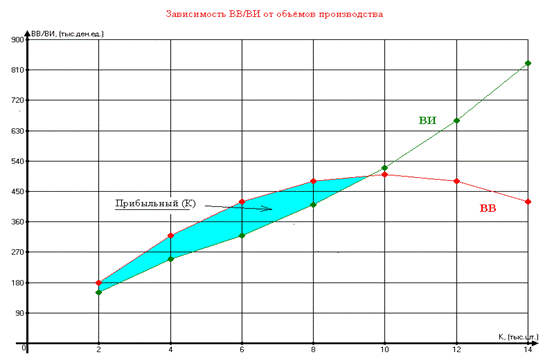 При К=10 (тыс. шт.), ΔВИ=110 (тыс. ден. ед.);