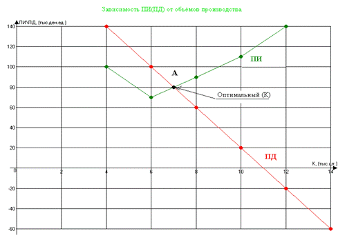 А – () пересечения графиков (ПИ\ПД от К) соответствует оптимальному объёму производства, т.к. при дальнейшем увеличении ПИ (начиная с К=6000 шт.), ПД начинает снижаться, а вместе с ним уменьшается и прибыль.
