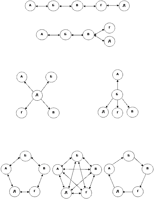 - Круговые – коммуникации осуществляются децентрализовано (по кругу) («круг», «всеканальная», «вертушка»).[1, с. 75]
