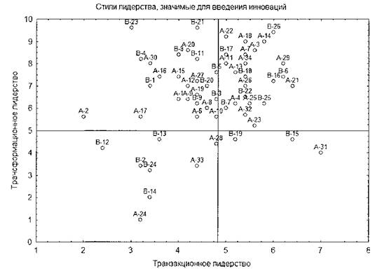 Показатели стиля инновационного лидерства:соотношение транеформацинного лидерства (оптимального для организационных изменений) и транзакционного лидерства (оптимального для стабильных периодов). Методика «Многофакторный опросник лидерства» Б. Басса (адаптация и стандартизация Института психологии творчества, инноваций, арт-комммуникаций УНИ ЮУрГУ). Диагностика стиля лидерства по данному опроснику позволяет выявить общий уровень представлений менеджеров о специфике стилей лидерства, значимых для введения инноваций. По данным диагностики, структура лидерства руководителей в организациях, осуществляющих инновационные изменения, включает четкую дифференциацию стилей лидерства и оптимальную их структуру: трансформационное лидерство — верхняя граница нормы, транзакционное лидерство - нижняя граница нормы, самооценка результатов лидерства - выше нормы.