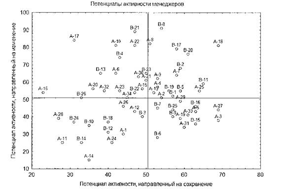 Менеджеры-«хранители» (21 %) с высокими показателями потенциалов активности, направленной на сохранение, и невысокими показателями потенциалов активности, направленной на изменение. 5. Менеджеры- «ориентирующиеся» (21 %) с невысокими показателями потенциалов активности, направленной на сохранение и на изменение.