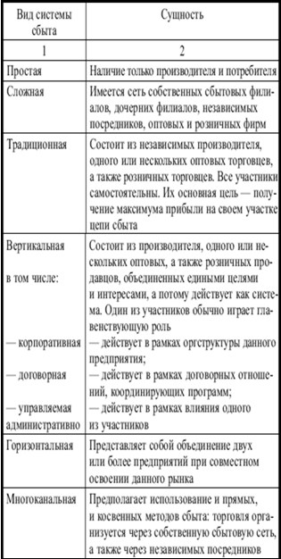 Организация сбытовой сети предприятий зависит от 3 основных факторов: типа продукции, характера потребления и географической протяжённости рынка. В соответствие с этими факторами различают три основных типа сбытовой сети: по регионам, по видам продукции, по типу потребления. При организации сбыта по регионам формируются региональные сбытовые подразделения; при сбыте по продукции отдельные подразделения специализируются на одном или нескольких видах продукции; при сбыте по типу потребления каждое подразделение закрепляется за одним или несколькими заказчиками. Выбор канала сбыта товаров является сложным маркетинговым решением, поскольку они самым непосредственным образом влияют на эффективность реализации концепции маркетинга на предприятии.