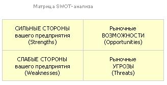 SWOT-анализ — это определение сильных и слабых сторон предприятия, а также возможностей и угроз, исходящих из его ближайшего окружения (внешней среды).