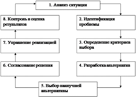 Принятие решения – не одномоментный акт, а результат процесса, имеющего определенную продолжительность и структуру. Процесс принятия решений - циклическая последовательность действий субъекта управления, направленных на разрешение проблем организации и заключающихся в анализе ситуации, генерации альтернатив, выборе среди них наилучшей и ее реализации.