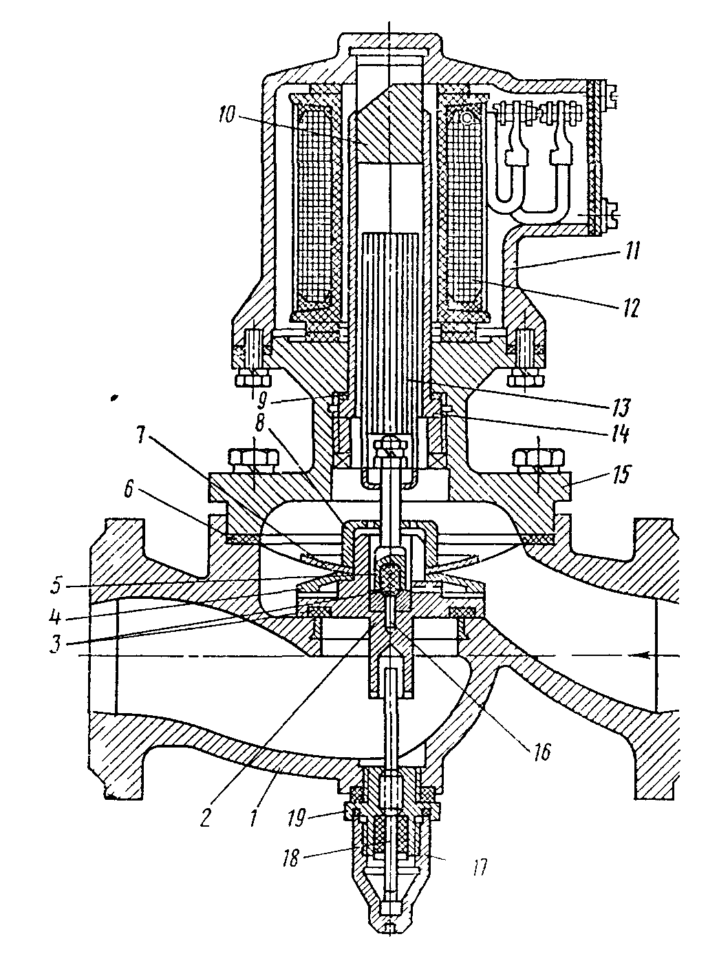 При включении тока сердечник 13, а затем и разгрузочный золотник 5 перемещаются вверх. Поднимаясь, разгрузочный золотник открывает разгрузочное отверстие 16 в основном золотнике и уменьшает перепад давлений на основном золотнике 2, т.е. разгружает его, а затем подхватывает и поднимает основной золотник, открывая вентиль для прохода газа. При выключении тока сердечник электромагнита, основной и разгрузочный золотники опускаются вниз. Надмембранная полость заполняется газом, и основной золотник плотно прижимается к седлу корпуса, обеспечивая герметичность затвора вентиля.