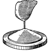 Заливка золота производится с помощью различных приспособлений, называемых у зубных техников литейными аппаратами, для обеспечения прогона жидкого металла давлением пара через тонкий литник. Цилиндр, или кювету, с литейной готовой формой устанавливают на треножник (рис 2.) и когда золото расплавится с помощью горелки, цилиндр накрывают штемпелем — крышкой, обмазанной мольдином (глина с глицерином). От соприкосновения мольдина с разогретым цилиндром образующиеся пары глицерина создают давление, под действием которого жидкое золото вгоняется в форму.