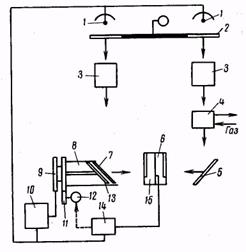 Hа рис. 1 изображена схема одного из возможных вариантов методической печи. Методические печи могут различаться числом отапливаемых зон, формой рабочего пространства, способами перемещения металла, подвода топлива и воздуха, сжигания топлива, а также по размерам и производительности, по виду нагреваемого металла, по типу обслуживаемых станов и ряду других признаков . Ниже рассматриваются в основном те особенности различных методических печей, которые влияют на создание систем автоматического управления нагревом металла в них.
