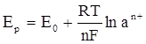В этом уравнении величины стандартного потенциала, газовой постоянной и числа Фарадея – это постоянные, валентность в данной электролите тоже величина постоянная. Т.к. в данном уравнении фигурирует абсолютная температура, то ее повышение на несколько десятков градусов существенно не изменит величину равновесного потенциала. На активность ионов в растворах простых солей практически невозможно повлиять путем изменения концентрации, т.к. увеличение концентрации в 10 раз увеличивает потенциал на 0,057 В (для одновалентных ионов) или на 0.029 В (для двухвалентных ионов). Совершенно очевидно, что для сближения потенциалов, стандартные значения которых отличается на десятые доли вольта или вольт, недостаточно прибегнуть к сильному повышению или понижению концентрации ионов в электролите. Повышать концентрацию ионов в электролите на много порядков нельзя из-за ограниченности растворимости солей, а уменьшать концентрацию ионов путем разбавления раствора тоже нельзя.