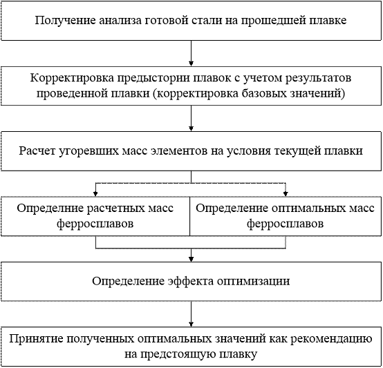 Автоматизированная система управления, раскисление и легирование стали, модель, алгоритм, оптимизация, окисленность плавки, угоревшие массы элементов, расчетные и оптимальные массы ферросплавов, процедура адаптации коэффициентов пересчета, прогнозирование контролируемых параметров и времени слива.