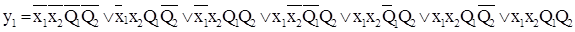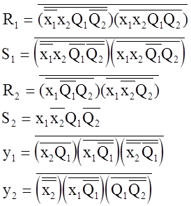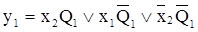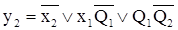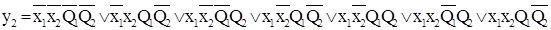5. По таблицам выходов составляем уравнения логических функций для выходных сигналов y1 и y2 , учитывая, что в каждой клетке левый бит – y1 , а правый бит – y2 .