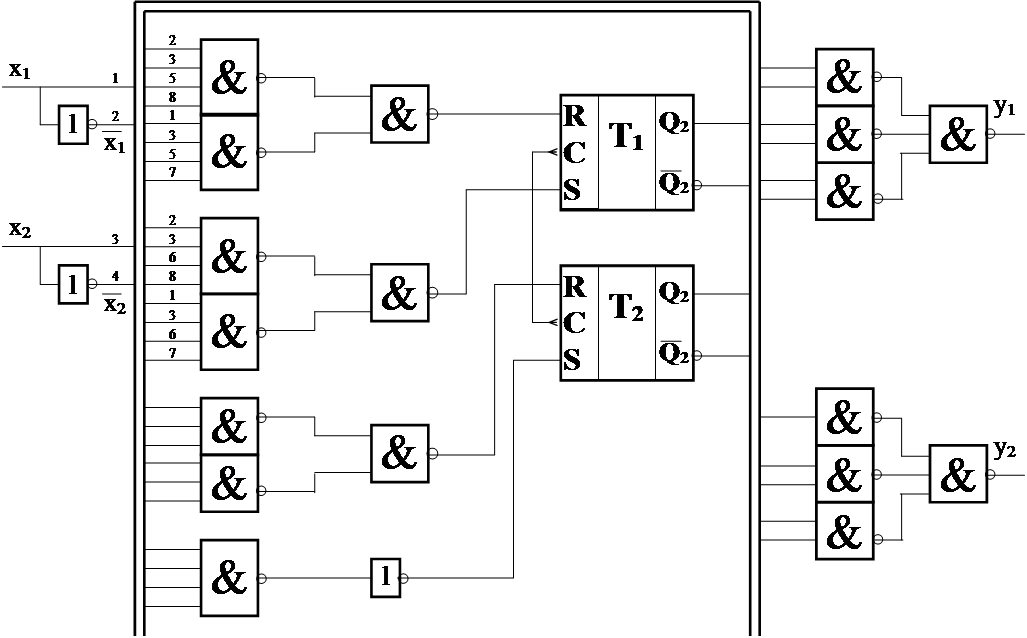 9. По системе уравнений минимизированных функций входных, выходных сигналов и сигналов возбуждения элементов памяти составляем логическую схему цифрового автомата.