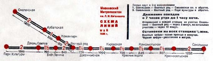 Движение началось от станции "Сокольники" до станции "Охотный ряд" и далее по разветвлению - до станций "Парк культуры" и "Смоленская". 13 прекрасно выполненных и богато архитектурно оформленных станций-дворцов, залитых потоками света, гостеприимно раскрыли двери вестибюлей перед трудящимися Москвы и всей нашей страны.