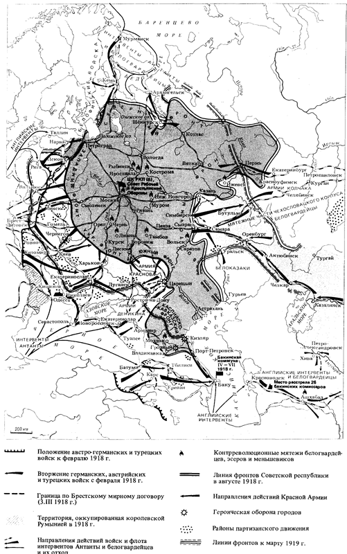 Еще не окрепшая Советская республика была втянута в тяжелую, кровопролитную, длившуюся более трех лет войну против империалистической интервенции и буржуазно-помещичьей контрреволюции. Судьбы народов России зависели от того, сумеет ли Советская власть в военной схватке отбить нападение многочисленных и сильных врагов и отстоять завоевания Октябрьской революции, свободу и независимость страны.