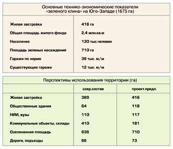В конце 60-х годов на этой территории предполагали разместить Всемирную выставку, но позднее она окончательно была зарезервирована как парковая - «зеленый клин» для прохождения свежего воздуха в Москву и организации досуга москвичей. Кстати, парк здесь планировался еще в 30-е годы, но идея эта была реализована только частично (парк 50-летия Октября и Парк XX партсъезда). Начинается «зеленый клин» у кольцевой автодороги. Это одно из самых высоких мест Москвы, отсюда имеет преимущественное направление роза ветров в городе. Прилегающие плотные зеленые массивы Подмосковья, а также почти полное отсутствие вредных промышленных предприятий делают эту территорию особенно привлекательной, недаром здесь всегда любила селиться московская элита. Часть территории, примыкающая к Ломоносовскому проспекту, отведена под развитие МГУ. Но при современной экономике быстрое ее освоение научным центром представить трудно. В обозримом будущем маловероятно убрать отсюда существующий «шанхай» - нагромождение железнодорожных путей, самостройных гаражей и так далее. «Зеленый клин» постоянно понемногу «откусывали». Одним из первых пострадал значительный участок около современного метро «Проспект Вернадского» (кварталы 34-35 и 32-33, площадью примерно 72 га каждый). В начале 60-х годов здесь были возведены два квартала «пятиэтажек», находящихся сейчас почти в аварийном состоянии. Затем вдоль проспекта Вернадского строят административные здания закрытого ведомства, чуть позже отводят место под жилые кварталы Никулино, Тропарево-Никулино, улицу Коштоянца, Мичуринский проспект. Даже в уже существующий парк вторгается кирпичная застройка на улице Удальцова. За всем этим следует сооружение новых кварталов Раменок, Олимпийской деревни-80 и так далее. Значительная территория отдается под временные гаражи и другие сооружения. Резервы «клина» сжимались как шагреневая кожа...