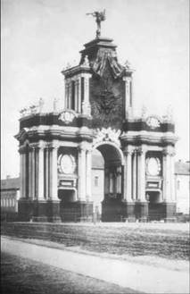 Вернемся на площадь Красных ворот, где в 1930-х годах архитектурная ситуация стала резко меняться. После сноса ворот и возведения здания НКПС на противоположной стороне Садового кольца в 1935 году вырос наземный вестибюль станции первой очереди метрополитена "Красные ворота", построенный по проекту известного практика и теоретика конструктивизма Н. А. Ладовского. Эта запоминающаяся композиция состоит из четырех уменьшающихся арок, образующих своеобразный перспективный портал-раковину.