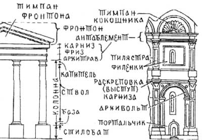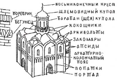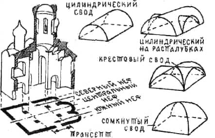 Строение в плане обычно имеет вид креста или прямоугольника, разделенного внутри опорными столбами на продольные помещения - нефы, или круга. Сверху здание завершается куполом с крестом. Купол может быть один или несколько: три, пять, семь и даже тринадцать.
