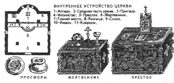 Церковь внутри делится на три части: алтарь, средняя часть, или собственно храм, и притвор.