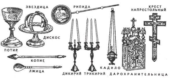 На жертвеннике стоят священные сосуды: потир - чаша для причащения, дискос - круглое блюдо, на которое кладутся части просфор - специальных хлебов. Звездица - ее ставят на дискос, чтобы покровец (покрывало, которым закрывают дискос с просфорами) не касался просфор. Копие - род ножа для разделения просфор. Лжица - ложечка для причащения. Губка для отирания дискоса и чащи. Покровцы для дискоса, чаши и третий покров "воздух" - общий для обоих сосудов.