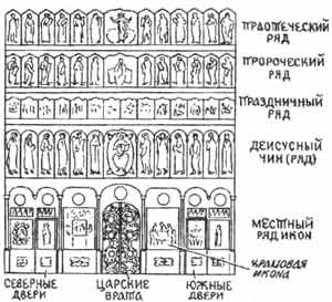 Стена иконостаса в русской православной церкви - это как бы символическая граница, отделяющая основное пространство церкви, где стоят прихожане во время богослужения, от алтаря - мира горнего, то есть высшего, духовного, вечного, грядущего. В ранних византийских храмах алтарь отделялся лишь невысокой преградой. Постепенно иконостас рос в высоту, заполняясь иконами. С XVI века он представляет собой пять рядов икон, разделенных тяблами - горизонтальными брусьями. Они покрыты рисованным орнаментом, а в более поздних храмах - резьбой и позолотой.