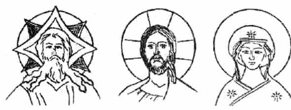 | Византийская иконография предписывает давать изображения Бога Саваофа — со звездчатым нимбом, Иисуса Христа — с крестчатым, святых — с круглым. |