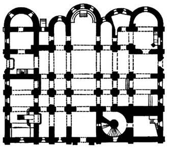 Софийский собор - пятинефный трехапсидный десятистолпный храм. С трех сторон (кроме восточной) к нему примыкают широкие двухэтажные галереи. В западной галерее южнее входа размещена лестничная башня. Столбы храма крестчатые, во всех внутренних и наружных стенах им отвечают плоские лопатки. Хоры имеют большую площадь, занимая западное членение центрального нефа, 2 членения средних нефов и целиком крайние боковые. В центральном нефе и трансепте хоры открываются в подкупольное пространство двойными арками, опирающимися на промежуточные столбы (круглый в центральном нефе и граненые в трансепте). Во втором ярусе у промежуточных столбов квадратное сечение, а столбы, поддерживающие своды над юго-западной и северо-западной частями хор, граненые. Все своды, на которые опираются хоры, цилиндрические, повернутые осями по линии север-юг. В первом ярусе галерей в средней части западного и южного фасадов проемы были открытыми, а на остальных участках, так же как и на всем периметре второго яруса галерей, закрытыми. Вход на хоры идет из юго-западной части собора через лестничную башню на западную галерею второго яруса, а оттуда внутрь храма. Каменная лестница несколько раз обвивает круглый столб, размещенный в центре. Ступени лестницы имеют большую ширину, между ними часто встречаются площадки. Минуя проход на хоры, лестница продолжается до верха башни, откуда имеется выход на крышу собора.