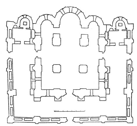 Начало исследованию пристроек к основному ядру храма положили небольшие разведки, проведенные И. М. Хозеровым в 1924 г. У северо-восточного угла храма было вскрыто начало апсиды северного придела. Юго-восточный придел был раскопан несколько шире. В 1961 г. М. X. Алешковским были вскрыты руины северо-восточного придела. Как выяснилось, это маленький бесстолпный храмик, почти часовня, с апсидой неправильных очертаний (толщина стен 70 см), ожив-ленный с фасада двумя прямоугольными тягами (20X15 см). Придел приложен к храму с осадочным швом в 4-5 см. В центре апсиды - сло-женный из плинфы престол. В северном торце имелась полукруглая ниша жертвенника. Кладка придела из той же плинфы, что и церкви. Задачей археологических работ 1967 г. было полное вскрытие южного придела и решение вопроса о характере галереи . В апсиде южного придела хорошо сохранилось основание маленького (63X83 см) престола, сложенного из обломков локальной плинфы, с внутренним "шкафом". На стенках апсиды местами уцелели фрагменты белой штукатурки, но без следов росписи. Алтарь отделен от помещения для молящихся кирпичной преградой, встроенной (не вперевязь) в торцовые стенки апсиды. На внешней поверхности преграды сохранилась роспись, имитирующая "полилитию". Орнамент в целом обрамлен полосой красной охры с белой окантовкой. Слева, под нишей жертвенника, - красно-коричневый ромб с белой серединой и треугольниками по углам. Правее - сплошной красно-коричневый ромб на белом фоне (впрочем, первоначально фон мог быть зеленым - сохранились отдельные мазки зеленой краски). Далее к югу- рамка нового раппорта: болыпой прографленный циркулем круг с треугольниками по углам. Западные углы придела ограничивали два мощных пилона на оси храмовой полуколонны. Между ними и алтарной частью выложены вперевязь ящики саркофагов, т. е. придел задуман сразу как усыпальница. Было найдено сохранившееся детское погребение. Кроме того было обнаружено нарушенное и ограбленное помещение в галерее, примыкающей к приделу. полы галереи выстланы плинфой. Однако в северо-восточном углу галереи найдены два фрагмента плиток ярко-желтого и темно-коричневого цвета. О том, что галереи, как и храм, были украшены стенописью, кроме остатков росписи в южном приделе, свидетельствуют найденные мелкие обломки росписи и широкошляпочные гвозди, служившие для укрепления грунта.