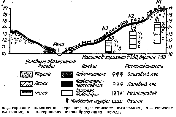 Растительный покров наносится на линию профиля в виде условных знаков, выбираемых для основных растительных группировок. Для каждой растительной породы устанавливается свой особый знак.