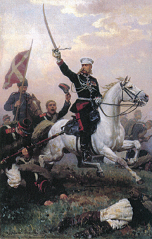 В нижнем этаже располагалась так называемая официальная приемная, куда в первую очередь попадал каждый гость, приезжавший к Скобелевым. Обстановка приемной отличалась строгостью: большой письменный стол черного дерева с тяжелым серебряным письменным прибором, изображавшим группу всадников, обтянутая темной кожей мягкая мебель, на стенах в числе прочих картин и рисунков — портреты трех генералов Скобелевых, в стеклянной витрине — походные и парадные мундиры Дмитрия Ивановича и Михаила Дмитриевича; стену над большим диваном покрывал широкий турецкий ковер, увешанный оружием.