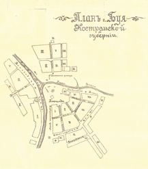 К 1850 году, по прошествии трех с лишним столетий после основания города, в Буе значились строения: «казенный каменный 1 и деревянных 2; церковный деревянный 1; общественных деревянных 3; частных: 1 каменный и 257 деревянных; каменный и 4 деревянных казенных магазина, 1 общественный магазин, 1 гостиный двор с 9 лавками и 10 отдельных лавок. Частные дома принадлежат: дворянам, служащим и не служащим — 36, военным и чиновникам служащим и отставным — 3, священнослужащим — 4, церковнослужителям — 6, купцам — 4, мещанам — 148, крестьянам и солдатам как служившим, так и отставным — 57. <…> 2134 жителя, из коих 1262 женского и 872 мужского пола»18. Это — масштабы скорее большого села, чем уездного города.