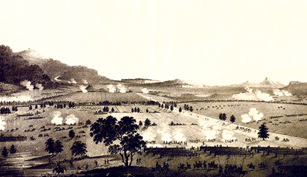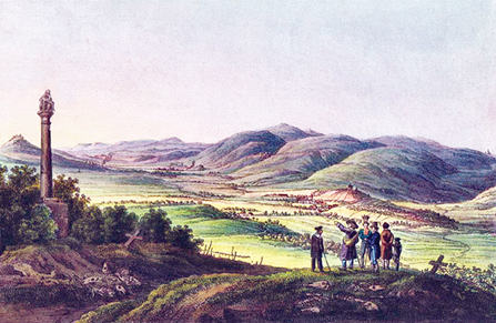 Впервые Кульмское поле сражения было изображено участником события - офицером лейбгвардии гусарского полка А. И. Дмитриевым-Мамоновым6, состоявшим тогда адъютантом А. П. Ермолова. Этот рисунок входит в серию, посвященную кампаниям 1812-1814 годов и позже (1818-1822) литографированную художником Военнотопографического депо С. П. Шифляром7. Рисунок выполнен во второй день сражения, то есть 18 августа 1813 года, с возвышенного места позади позиции русских войск, запечатленной на переднем плане. На среднем плане - постройки селения Пристен, далее - дымы от выстрелов французских пушек, а за ними - селение Кульм, левее которого возвышается гряда, увенчанная часовней Святой Троицы. Во время битвы здесь находился штаб Вандамма. За часовней - дорога, плавно огибающая горный склон и скрывающаяся в лесу; она ведет к перевалу в селе Ноллендорф, церковь которого видна на вершине в левой верхней части изображения. Следует отметить, что расстояние от Пристена до этой церкви составляет по прямой 8 километров, а перепад высот - 460 метров8.