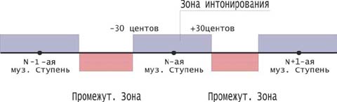 Зону, в которой сохраняется индивидуальность музыкального интервала мы будем называть зоной звуковысотного интонирования или просто зоной интонирования, и, в связи с относительной точностью[20] результатов исследований, будем считать ее равной 60 центов (± 30 центов от точки настройки ступени) (см. рис. 2).