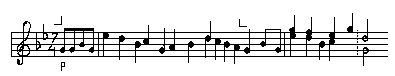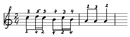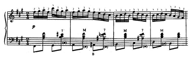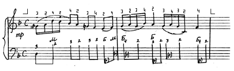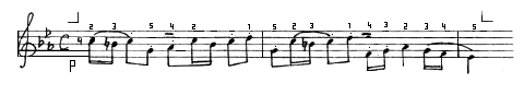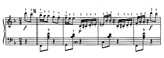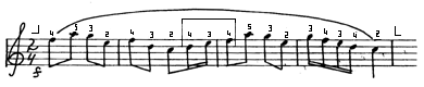 Мелодия движется поступенно и, казалось бы, аппликатура должна соответствовать гаммаобразному принципу. Однако, если посмотреть при этом на пальцы, то нетрудно убедится, что 4-й палец с ноты ре на си и 2-й палец с до на ля будут двигаться заметно скорее, чем остальные (причиной этого является скрытый интервал терции, появляющейся через один звук). Подобные ускорения вызывают суетливые движения пальцев и приводят к неритмичности.