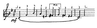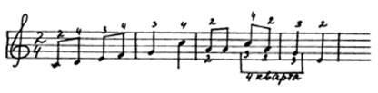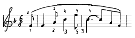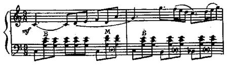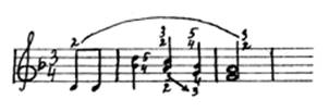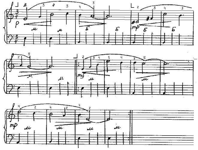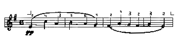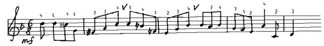 Здесь ноты до и соль обязательно следует брать разными пальцами (4-м и 2-м), а не одним (3-м), так как при этом третий палец вынужден будет двигаться гораздо скорее, чем остальные. Это допускается лишь тогда, когда нет иного выхода, когда нормальная аппликатура исключается предыдущим или последующим движением.