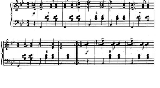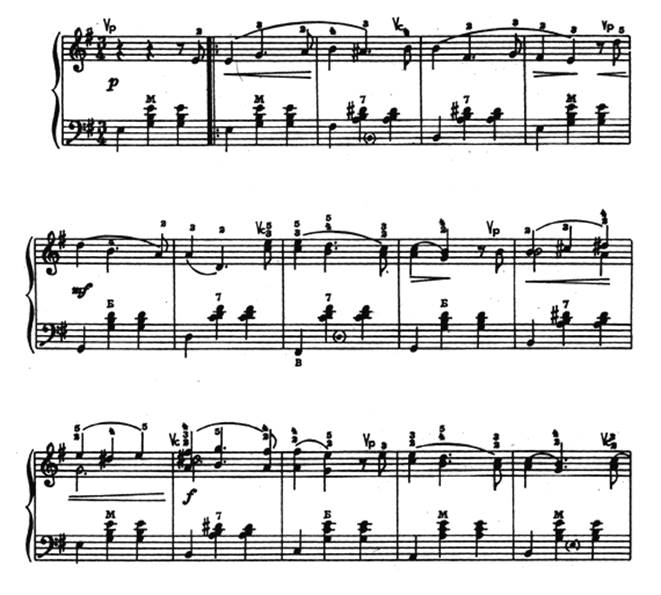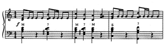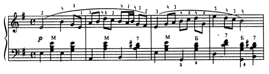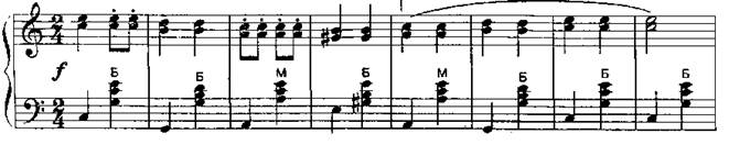 В мелодии, построенной на мелких дробных ритмических длительностях, особенно в быстрых темпах, такое связывание баса с аккордом (“педализация баса”) и выдерживание полной длительности в аккордах сопровождения будет только мешать мелодии, отяжелять и заглушать её. Выдерживание аккордов сопровождения возможно лишь тогда, когда они не заглушают мелодию, а наоборот поддерживают её: