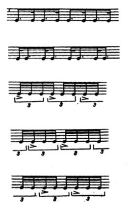 Для более прочного закрепления трудной фигурации полезно поиграть её различными ритмическими фигурами, в том числе пунктирными. При такой игре каждый палец поочерёдно как бы фиксируется на нужной клавише: